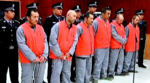 سوت مەھكىمىسىنىڭ 28-ئىيۇل يەكەن ۋەقەسىگە چېتىشلىق دەپ قارالغان 6 نەپەر جىنايەت گۇماندارىنى «تېررورلۇق قىلىش» جىنايىتى بىلەن سوتلاۋاتقان كۆرۈنۈش. 2014-يىلى 13-ئۆكتەبىر، قەشقەر.